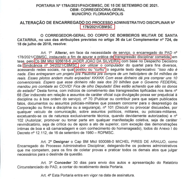 Isto porque Jader João da Silveira teria curtido ou compartilhado um texto “depreciativo” à corporação. (veja abaixo).