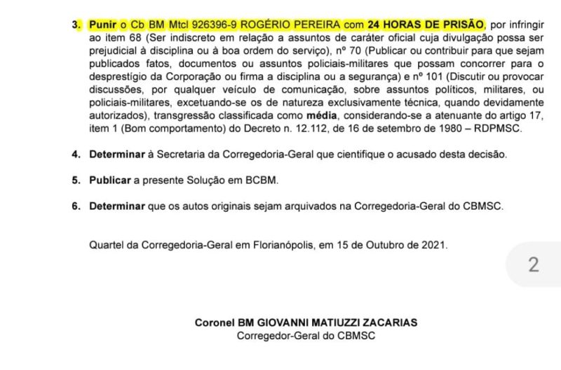 “O Comando-Geral do Corpo de Bombeiros Militar de Santa Catarina (CBMSC) informa que exige de todos os seus integrantes a observância aos pilares da disciplina e hierarquia, qualquer que seja seu posto ou graduação. Preceitos estes, base do militarismo.