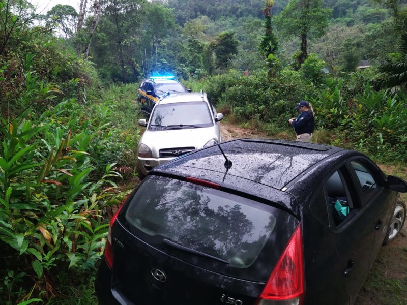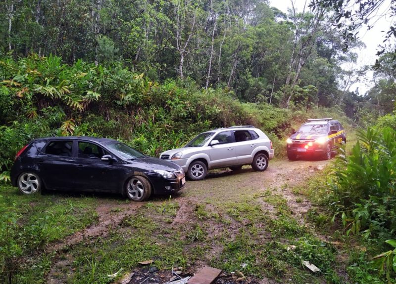 Com a informação, os policiais foram até o local, aparentemente um sítio abandonado em uma região de mata às margens da BR-101, em Garuva, onde três veículos com registro de roubo ou furto foram encontrados.