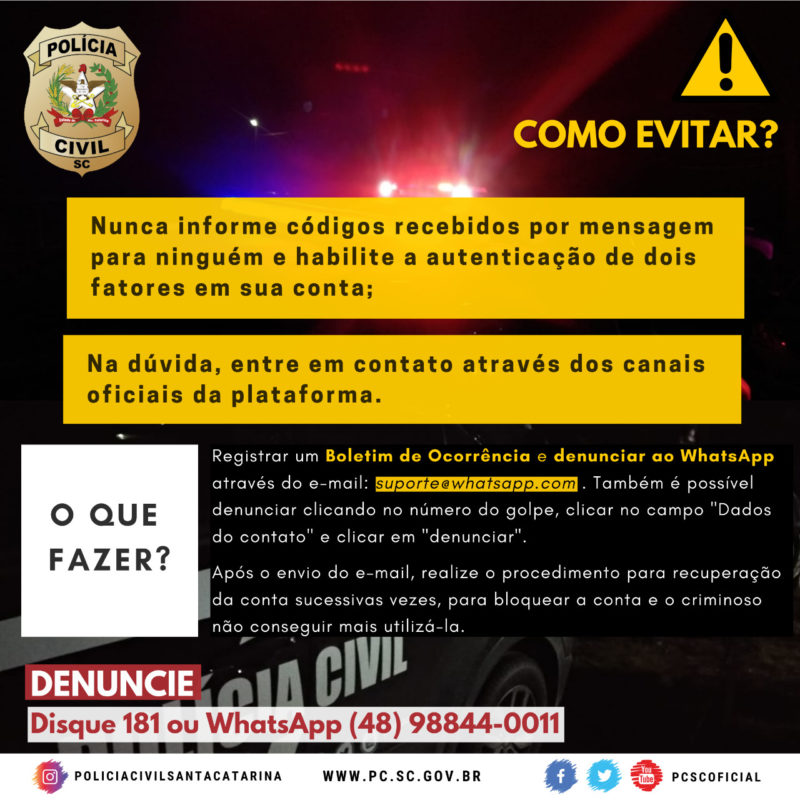 - Registrar um Boletim de Ocorrência e denunciar ao WhatsApp por meio do e-mail: suporte@whatsapp.com. Também é possível denunciar clicando no número do golpe, clicar no campo “Dados do contato” e clicar em “denunciar”.