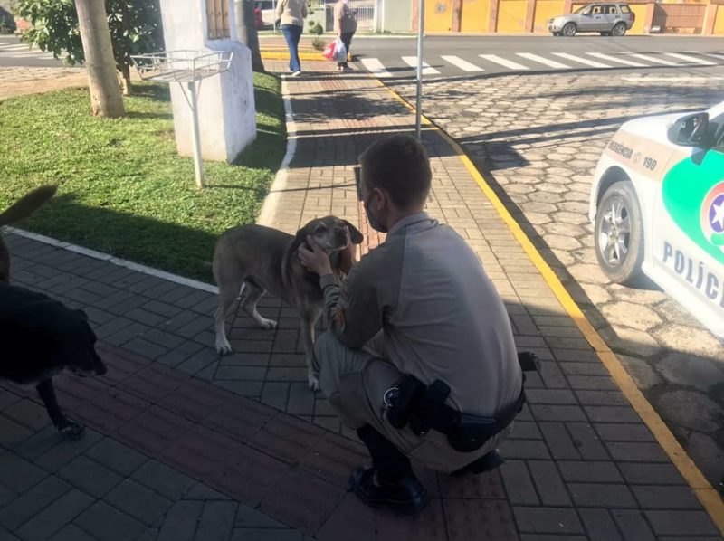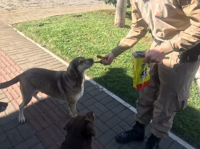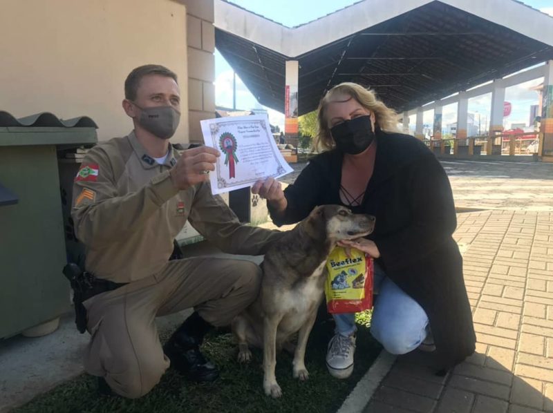Mas como título não enche barriga, o cãozinho que mora na rodoviária de Porto União também ganhou petiscos e ração – Foto: PM/Divulgação
