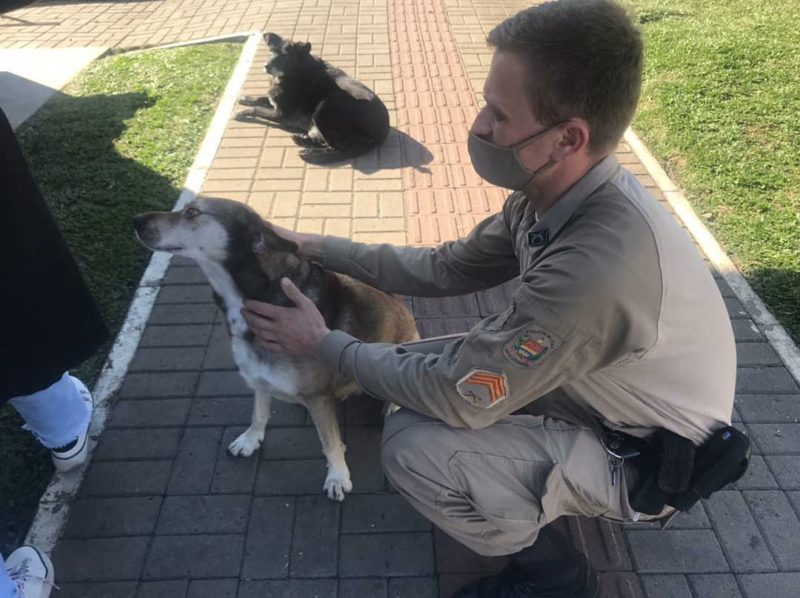 Acontece que o bom serviço prestado pelo cachorro que mora na rodoviária da cidade rendeu a ele uma bela homenagem: Piá recebeu da Polícia Militar o título honorífico de Cão Policial (K9).