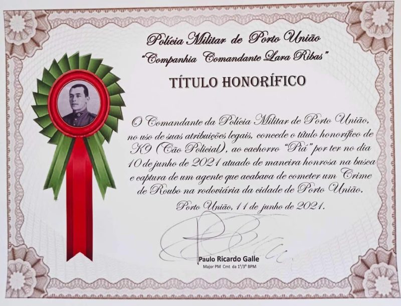 O Comandante da Polícia Militar de Porto União, Major Paulo Ricardo Galle, reconheceu a atitude do cão que, além do título, também ganhou ração, petiscos e muito carinho. Veja as fotos!