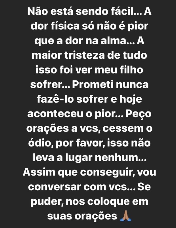 Em seu perfil no Instagram, Sylvie escreveu um post sobre o ocorrido: “Não está sendo fácil… A dor física só não é pior do que a dor na alma… A maior tristeza de tudo isso foi ver meu filho sofrer… Prometi nunca fazê-lo sofrer e hoje aconteceu o pior… Peço orações a vocês, cessem o ódio, por favor, isso não leva a lugar nenhum… Assim que conseguir, vou conversar com vocês… Se puder, nos coloque em suas orações”.