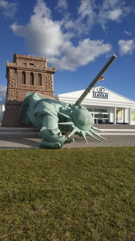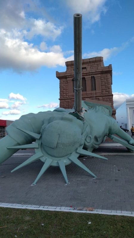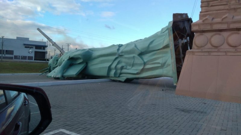 A Estátua da Liberdade da Havan de Capão da Canoa, no Litoral Norte do Rio Grande do Sul, caiu no pátio da loja, por volta das 6h30 desta segunda-feira (24). As causas ainda são investigadas, mas tudo indica que as fortes rajadas de vento tenham derrubado a estrutura, segundo o Pelotão de Bombeiros Militar. – Foto: Lucas Filho/ Jovem Pan/Reprodução - 2 de 7