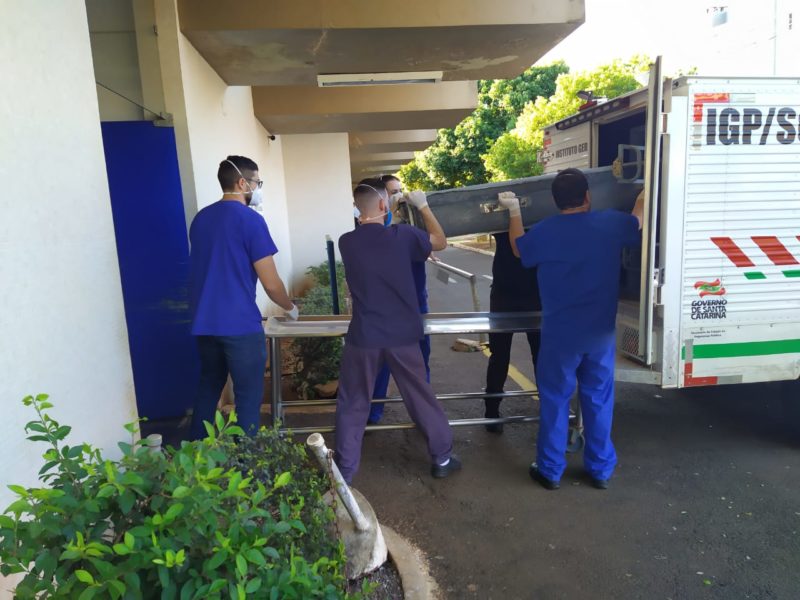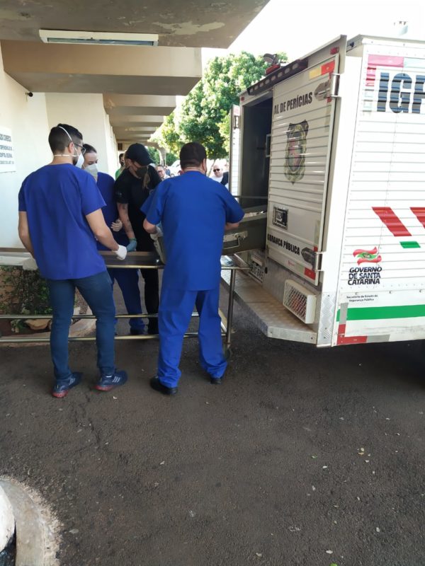 Os cinco foram trazidos no mesmo carro do IGP (Instituto Geral de Perícias). O horário para liberação dos corpos ainda não foi divulgado pelos órgãos competentes. As três crianças foram trazidas no mesmo caixão. – Foto: Ezequiel Marsango/NDTV Chapecó - 2 de 6