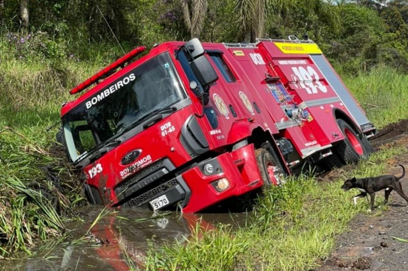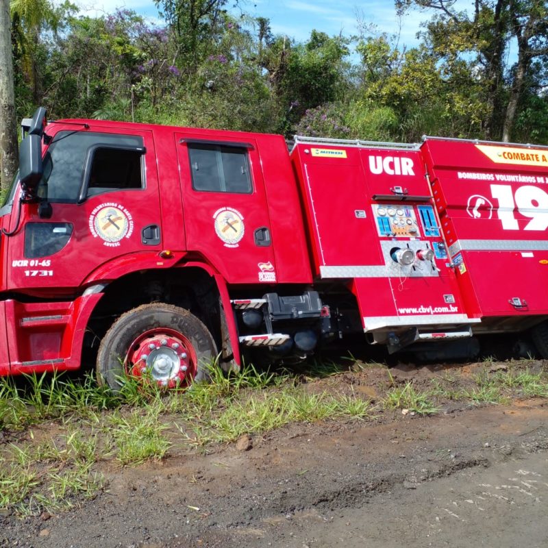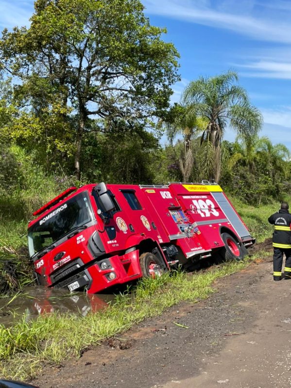 É que um caminhão dos bombeiros voluntários acabou caindo em uma valeta e ficou atolado no local, na zona Norte da cidade.