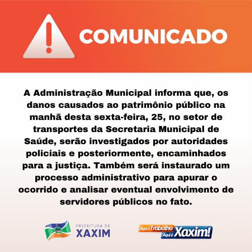 A prefeitura de Xaxim emitiu um comunicado e informou que um processo administrativo foi instaurado para apurar o caso. (Informações com a colaboração da Rádio Cultura de Xaxim). – Foto: Prefeitura/Divulgação/ND