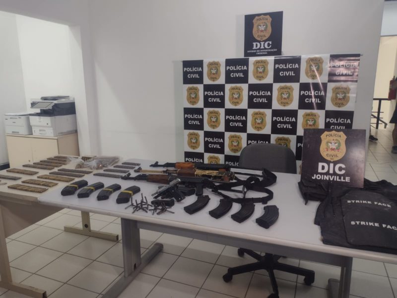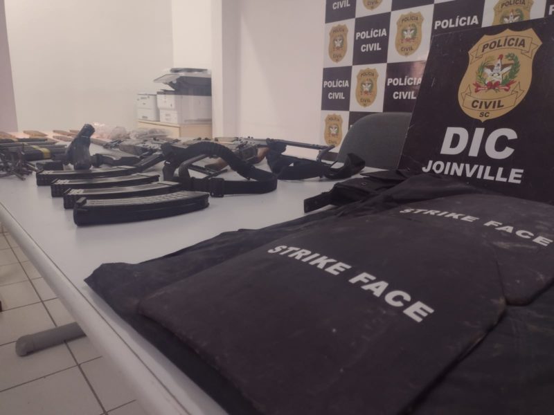 Além disso, houve apreensão de “miguelitos”, que são um objeto de pregos entrelaçados usado para furar pneus, armas de fogo e munição para disparos. As apreensões foram feitas em um galpão na rodovia BR-280, em Araquari.