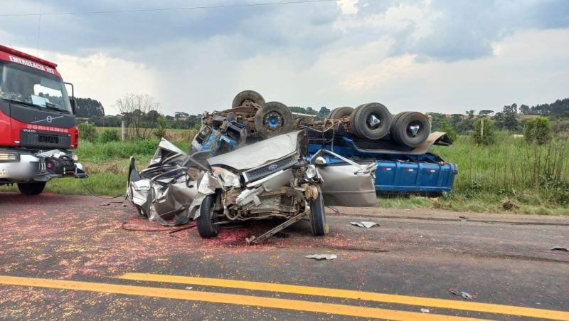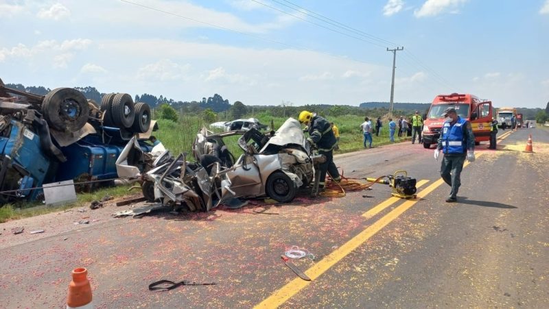 A situação dos passageiros do Ford Fiesta é diferente. O condutor, de 36 anos, e a carona, de 19 anos, ficaram encarcerados no veículo, que ficou totalmente destruído com o colisão traseira e frontal.