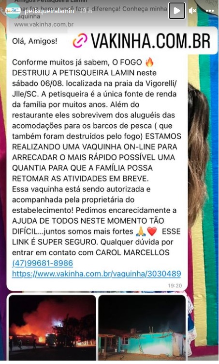 “O foto destruiu a Petisqueira Lamin neste sábado 06/08. A petisqueira é a única fonte de renda da família por muitos anos. Além do restaurante eles sobrevivem dos aluguéis das acomodações para os barcos de pesca ( que também foram destruídos pelo fogo) Estamos realizando uma vakinha online para arrecadar o mais rápido possível uma quantia para que a família possa retomar as atividades em breve. Essa vaquinha está sendo autorizada e acompanhada pela proprietária do estabelecimento! Pedimos encarecidamente a ajuda de todos neste momento tão difícil…juntos somos mais fortes ?❤️Qualquer dúvida por entrar em contato com CAROL MARCELLOS (47)99681 8986https://www.vakinha.com.br/vaquinha/3030489”, informou a publicação que está sendo compartilhada por muitos clientes, familiares e amigos.