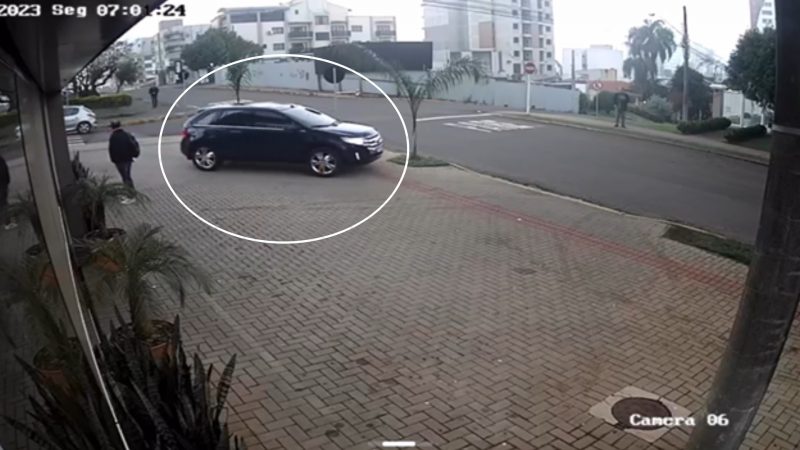 A polícia informou que a mulher tinha medida protetiva contra o homem, que se aproximou dela em um Ford Edge e atirou. Depois, ele se suicidou ainda no carro usando uma arma de fogo de calibre 38. Na imagem, o carro passa na calçada dos estabelecimentos.— Foto: Reprodução/Câmera de Segurança/ND - 5 de 9