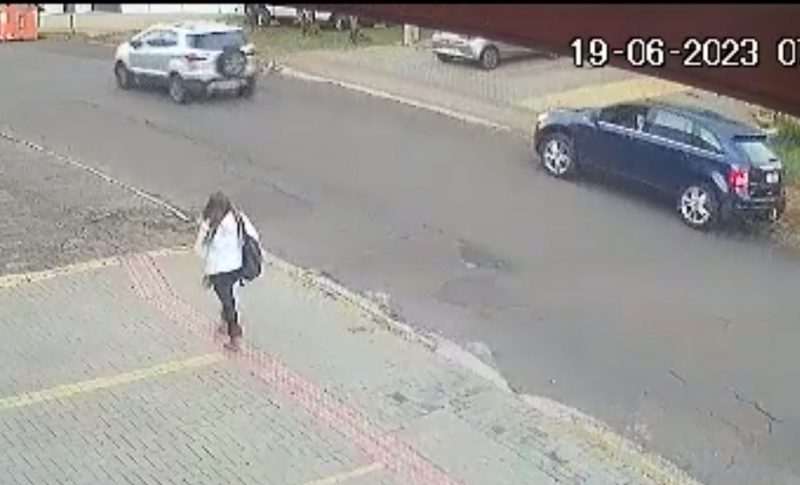 Essa imagem mostra que a mulher caminhava em direção ao trabalho quando começou a ser seguida pelo homem no carro. — Foto: Reprodução/Câmera de Segurança/ND - 9 de 9