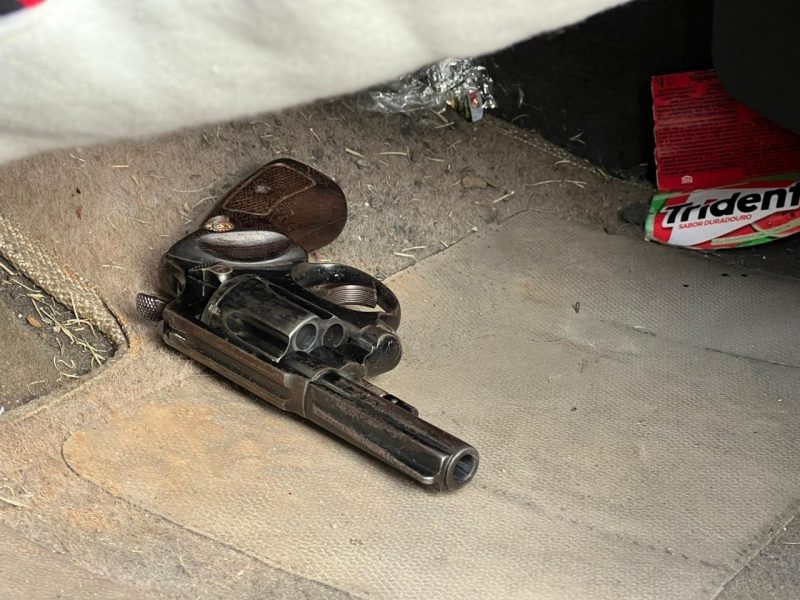A arma de fogo usada no crime foi apreendida pela Polícia Científica. O revólver ficou caído no automóvel. – Foto: Polícia Militar/ND - 7 de 9