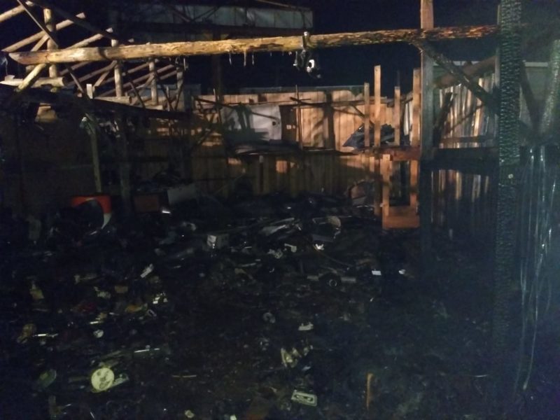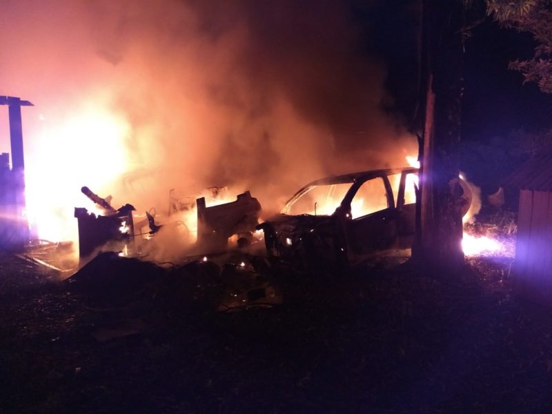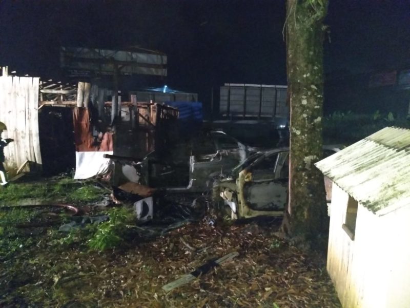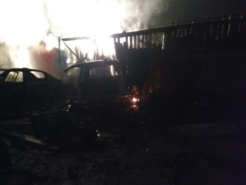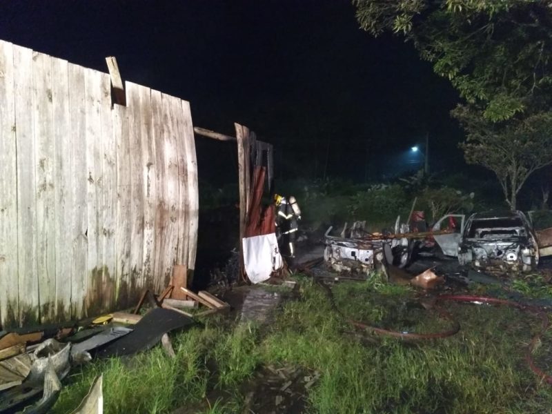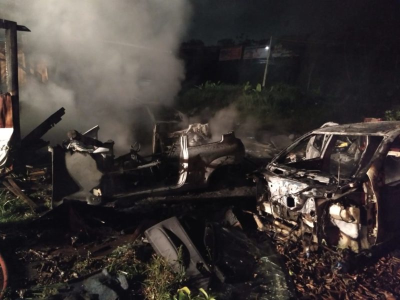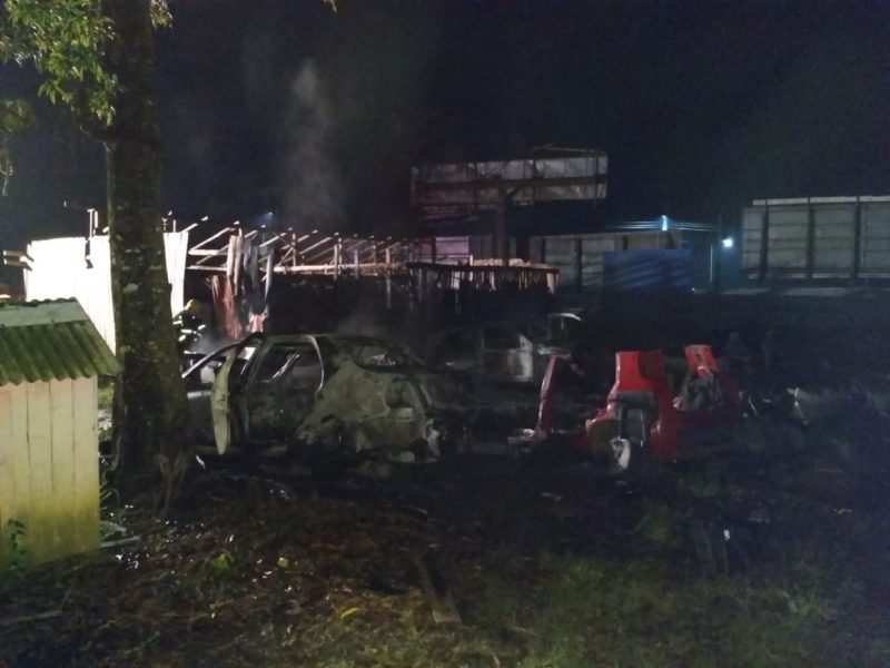Um ferro velho pegou fogo em Araquari, no Norte de Santa Catarina, na madrugada desta quarta-feira (13) e deixou quatro veículos totalmente destruídos pelas chamas.