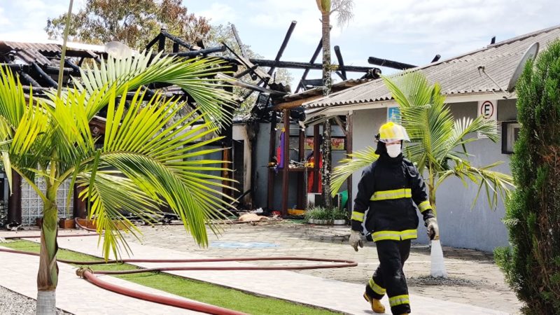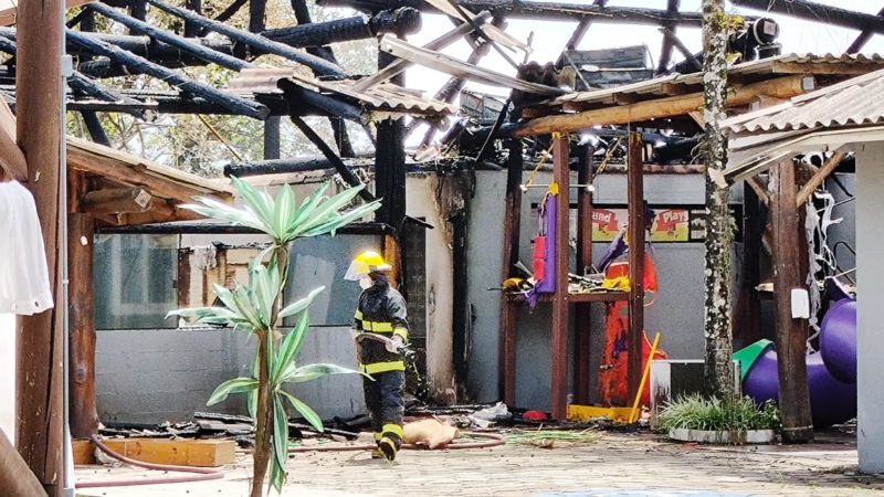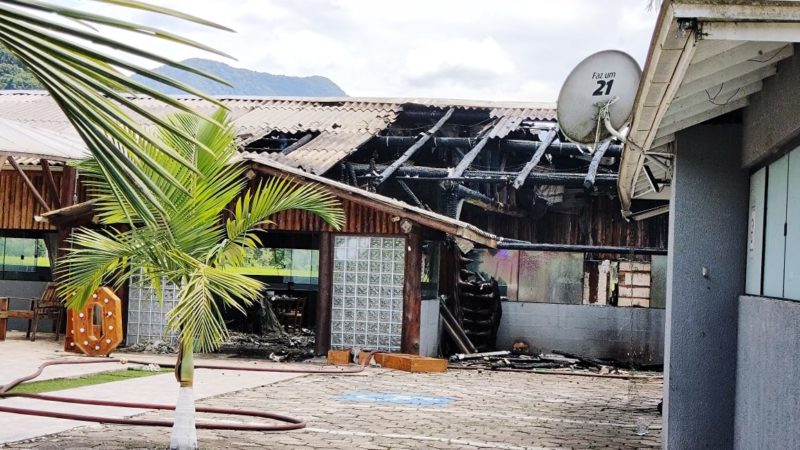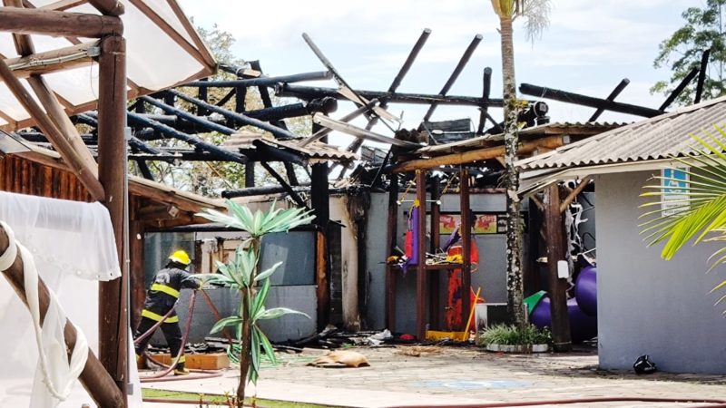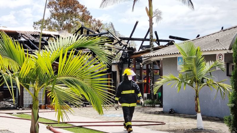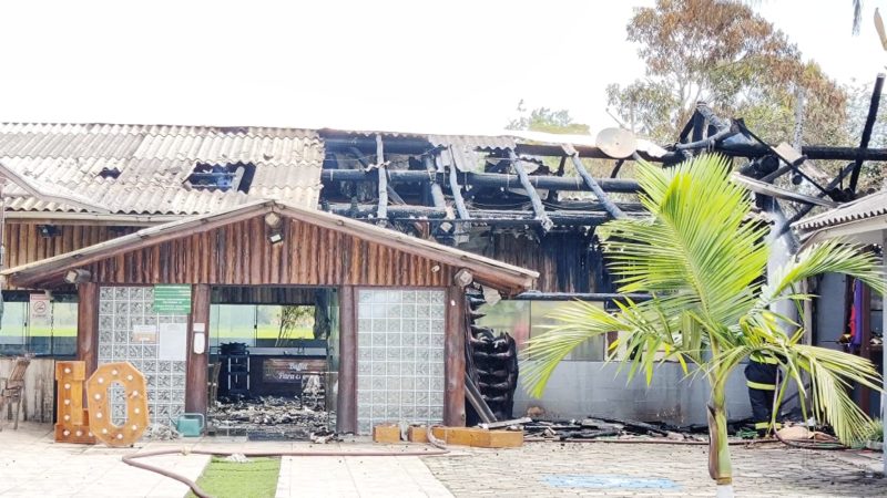 O fogo destruiu toda a cobertura do salão de festas, que é de madeira. – Foto: Maikon Costa/NDTV