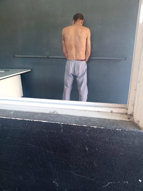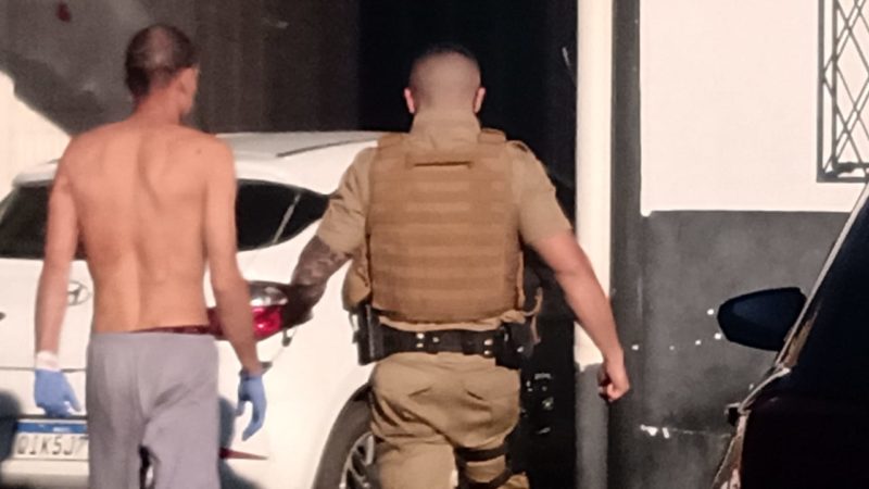 Suspeito foi encontrado com cortes nos pulsos e no pescoço e foi atendido no Hospital São José de Jaraguá do Sul. Logo em seguida, foi conduzido, pela PM, à Delegacia de Polícia de Jaraguá do Sul para prestar depoimento. – Foto Gabriel Junior/Divulgação ND