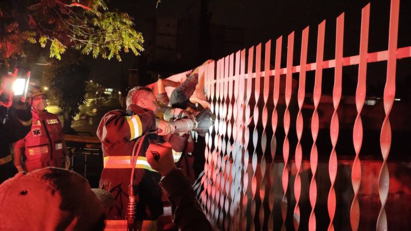 De acordo com a Polícia Militar, o homem estava dormindo no estacionamento do local e, quando acordou, percebeu que já estava fechado. Então, tentou pular a grade, mas ficou engatado pela perna.