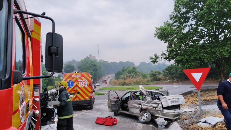 A batida entre um carro e um caminhão nesta manhã de quinta-feira (8) em Cordilheira Alta, no Oeste do Estado, deixou um homem de 86 anos ferido. O acidente aconteceu por volta das 11h na BR-282. – Foto: Bombeiros/ND - 2 de 3