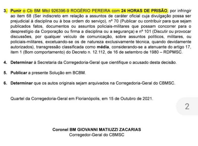 O comando dos Bombeiros Militares de Santa Catarina manteve a punição (prisão de 24 horas) a Rogério Pereira, presidente da Associação Brasileira dos Aviadores de Segurança Pública (Abrav) e cabo dos bombeiros militares.