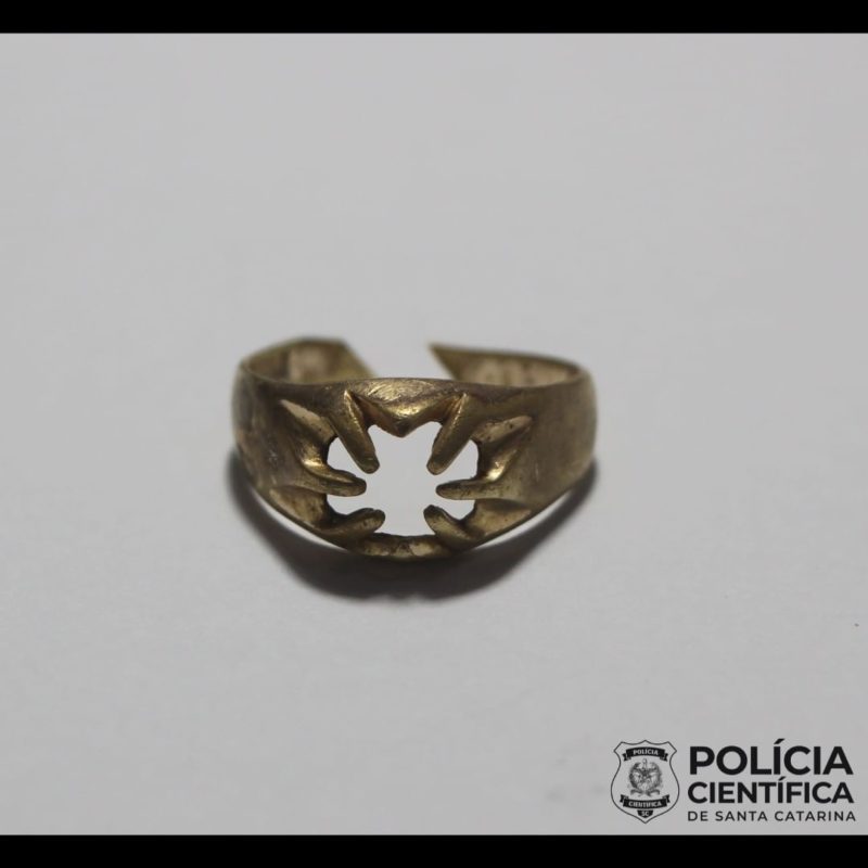 No dedo mínimo direito, anel dourado com abertura estrelada. No dedo anular esquerdo, aliança com o nome “Fernanda” gravado – Foto: Divulgação Polícia Científica de SC