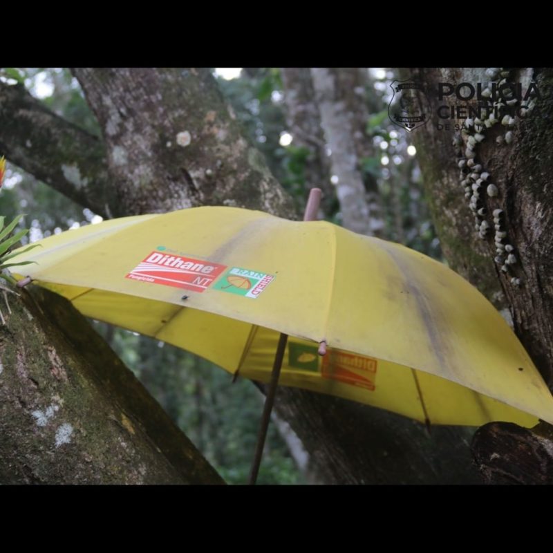 Guarda-chuva amarelo com estampas da marca “Dithane Fungicida”.- Foto: Polícia Científica de SC