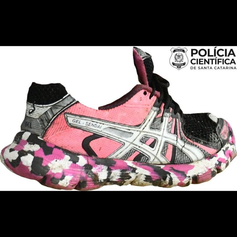Tênis Asics, modelo feminino, rosa com detalhes pretos, cinzas e brancos. – Foto: Polícia Científica de SC