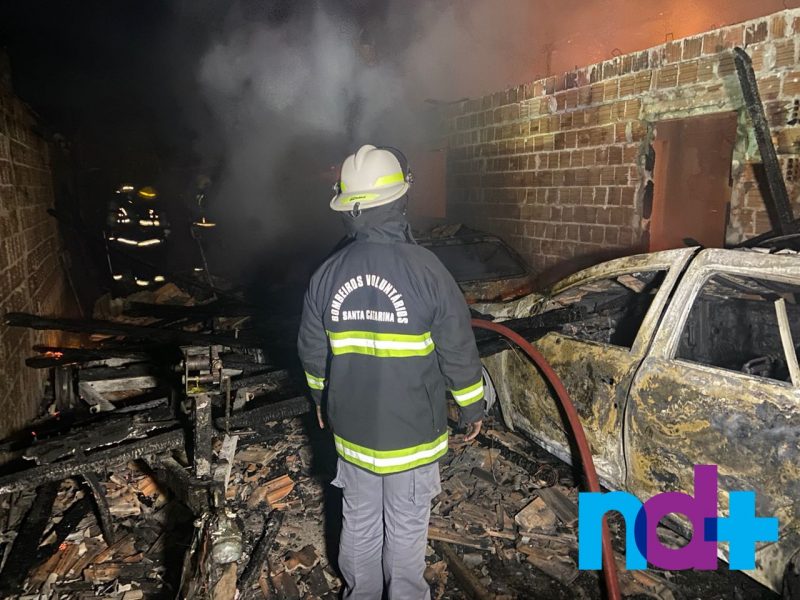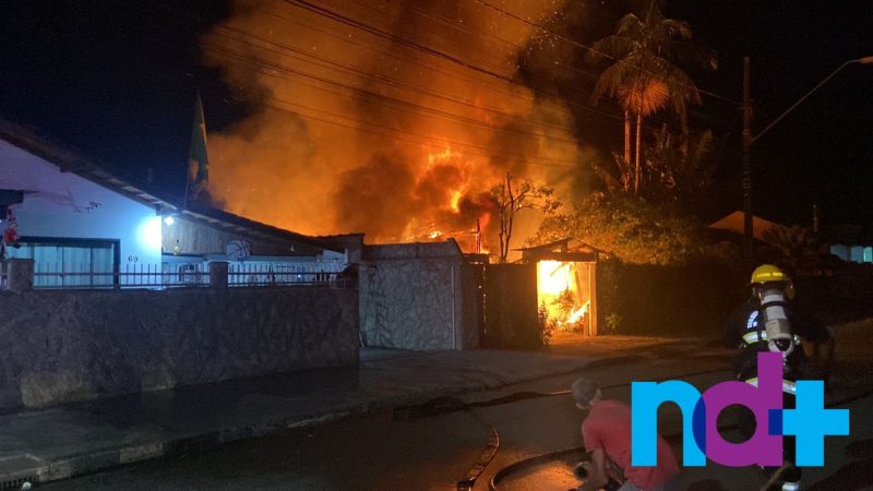 Um incêndio de grandes proporções destruiu completamente a casa de uma família de Joinville, no Norte de Santa Catarina. As chamas atingiram a residência por volta das 20h de quinta-feira (17), rapidamente se espalhou e destruiu a casa e os carros que estavam na garagem.