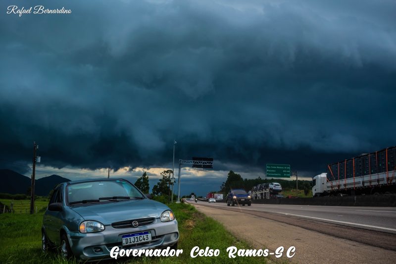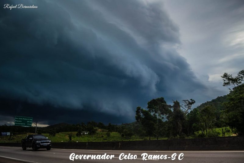 Especialistas consideram como uma nuvem perigosa, pois a formação imensa traz consigo a possibilidade de temporais, vendavais e até granizo. Foto: Rafael Bernardino, de Governador Celso Ramos - 3 de 15