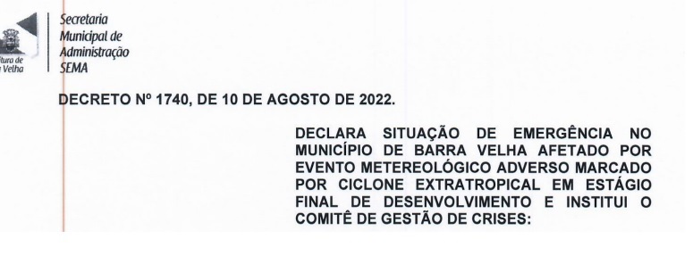 O prefeito Godofredo Gomes Moreira Filho também assinou decreto que declara situação de emergência nas áreas do município afetadas pelas fortes chuvas e ventania. Os estragos começaram às 6 horas desta quarta-feira, com alagamentos e deslizamentos. A chuva, com volume aproximado de 200mm, afetou todos os bairros do município, incluindo balneários e região central.