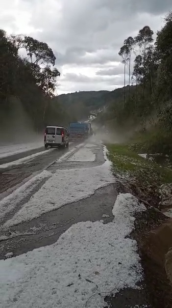 Estrada coberta por granizo em São Bento do Sul – Vídeo: Orlando Torinelli/Divulgação