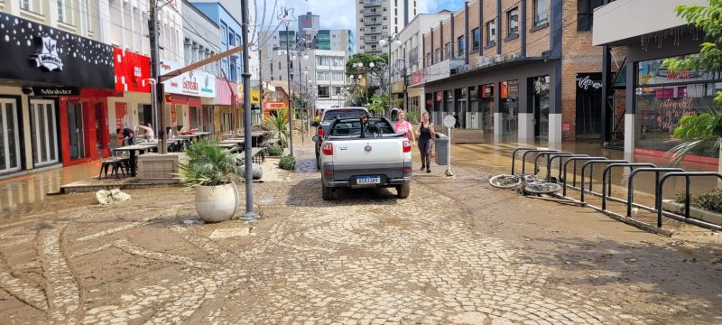 Calçadão Osny José Gonçalves, no Centro de Rio do Sul, também foi afetado e ficou coberto de lama – Foto: Lene Juncek/ND - 4 de 39