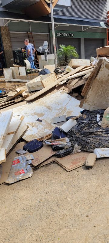 Caixas com produtos, prateleiras e móveis ficaram destruídos após pegar água. Diferente de cheias anteriores, muitos comerciantes não tiveram tempo de esvaziar suas lojas antes da enchente chegar, entre quinta (16) e sexta-feira (17), da semana passada – Foto: Lene Juncek/ND - 8 de 39