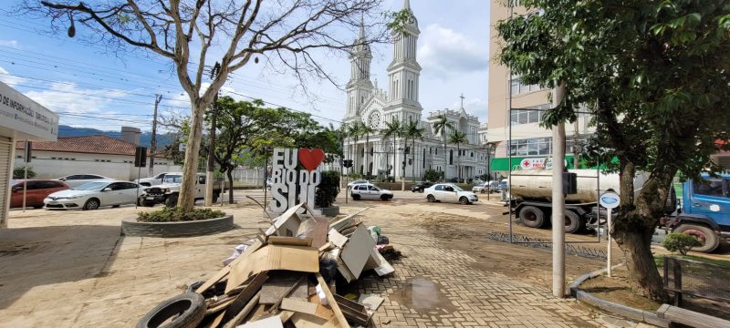 Ainda na tarde de domingo (19), a repórter Lene Juncek esteve conferindo de perto a situação de como ficaram algumas das principais vias e praças da área central de Rio do Sul. Na imagem, a praça Emembergo Pellizzetti, em frente à Catedral São João Batista, tradicional igreja do centro de Rio do Sul – Foto: Lene Juncek/ND - 3 de 39
