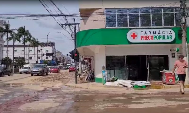 Situação do cruzamento da Alameda Aristiliano Ramos e da rua São João, em Rio do Sul, neste domingo (19); farmácia foi duramente castigada – Foto: Lene Juncek/ND - 21 de 39
