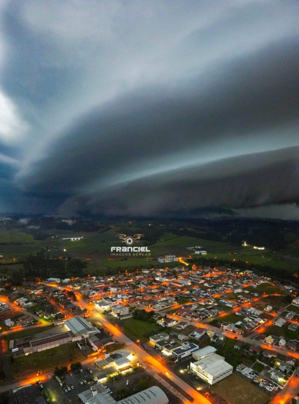 Além da incidência de raios, Ituporanga foi tomada por uma nuvem do tipo “prateleira”, que encobriu o céu da cidade. O meteorologista Piter Scheuer explica que a formação trata-se da nuvem Shelf Cloud. O fenômeno aparece justamente no período que antecede uma tempestade, favorecendo a incidência de fortes rajadas de vento e até granizo. – Foto: Franciel Imagens Aéreas/Reprodução/ND