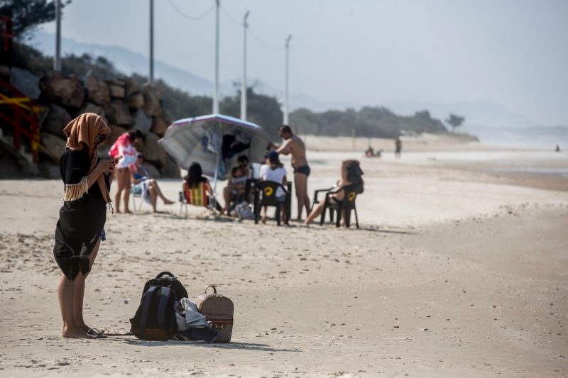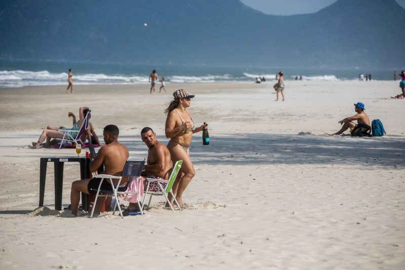 Os termômetros alcançaram a casa dos 28ºC neste domingo, o que levou muita gente para as praias catarinenses, apesar das restrições por causa da Covid-19
