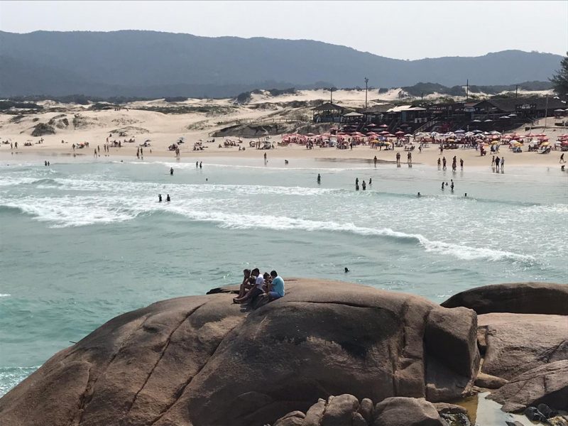 Apesar da proibição da permanência com cadeiras e guarda-sóis, a Praia da Joaquina estava cheia neste domingo (13). – Foto: Anderson Coelho/ND