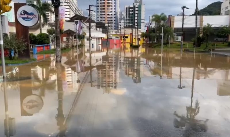 O início das ruas Camboriú, Desembargador Pedro Silva e Eugen Fouquet, também no bairro Victor Konder, ficou alagado – Foto: Erison Krueger Schneider/Imagens cedidas/Divulgação/ND - 8 de 11