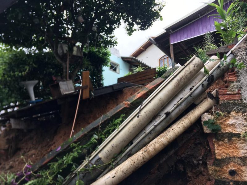 A casa, no bairro Agronômica, ficou parcialmente destruída. Às 8h, a Defesa Civil aguardava a chegada de materiais para conter o desmoronamento – Foto: Defesa Civil/Divulgação/ND - 10 de 12