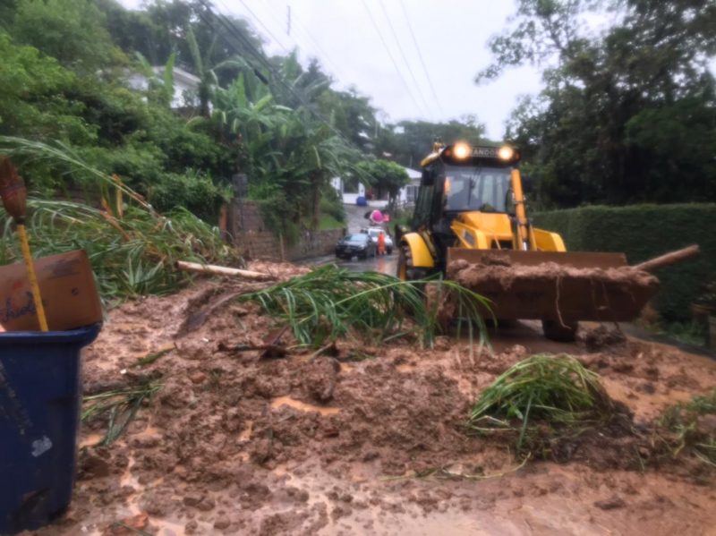 Um deslizamento em Ponta das Canas, no Norte da Ilha, danificou o muro de uma pousada, que cedeu e espalhou sedimentos na estrada Jornalista Jaime de Arruda Ramos. Via foi interditada pelos bombeiros por volta das 6h desta quinta-feira (21) – Foto: Ana Vaz/Divulgação/ND - 2 de 12