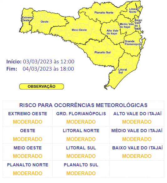 O sábado (4), será de tempo instável em todas as regiões de Santa Catarina. – Foto: Defesa Civil/Divulgação/NDO órgão alerta ainda, para o risco baixo a moderado para ocorrências relacionadas aos temporais com raios, rajadas de ventos e eventual queda de granizo, e chuva pontualmente intensa com deslizamentos e alagamentos pontuais.