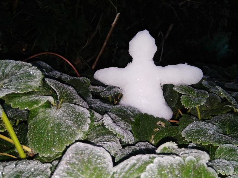 Um bonequinho de gelo em meio à plantação de morangos – Foto: Paulo Marcelo Adamek