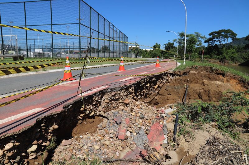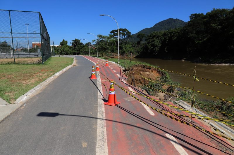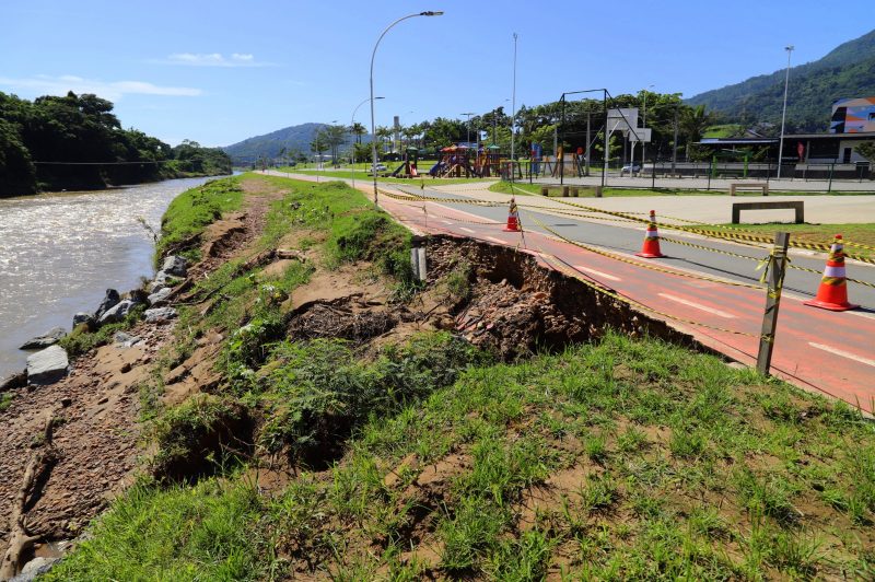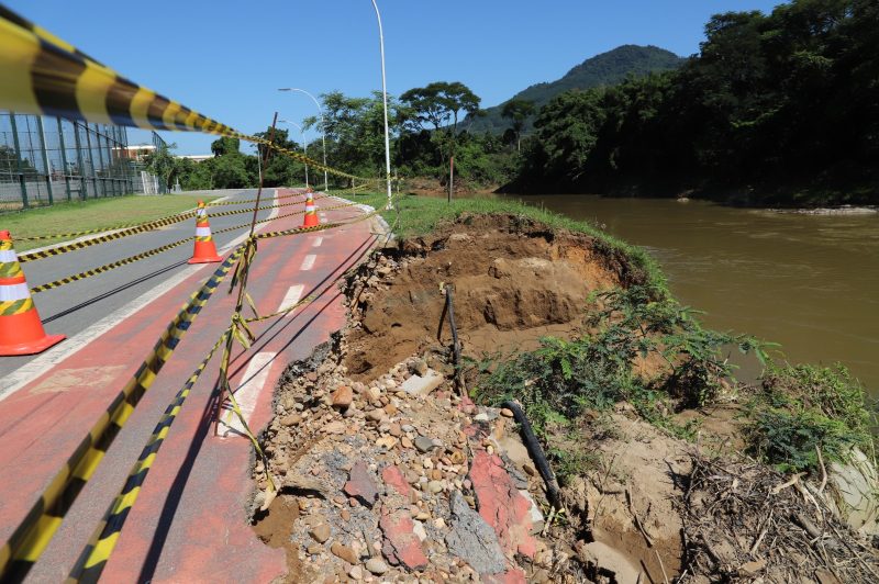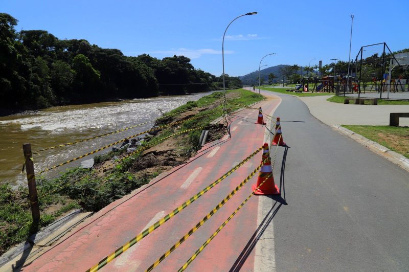 O barranco às margens do rio Itapocu cedeu com a chuva e causou estragos na ciclovia instalada no trecho. O local já foi isolado pelo município com cones e fitas sinalizadoras.