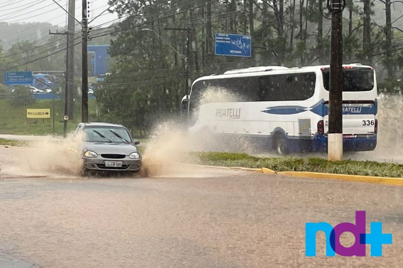 A estação do bairro Vila Nova indicou que o vento chegou a 41 km/h e o acumulado de chuva em uma hora de precipitação foi de 38 milímetros.
