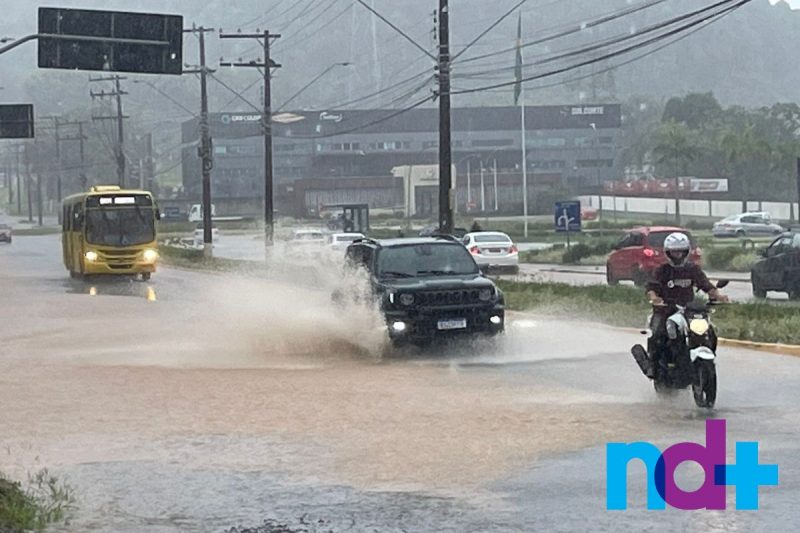 Em poucos minutos, a chuva que foi registrada na tarde desta quinta-feira (12) em Joinville, no Norte catarinense, já deixou estragos e alagou ruas. O temporal teve início por volta das 14h30 e durou pouco mais de uma hora.