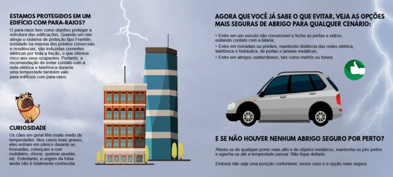 - Afasta-se de qualquer ponto mais alto e de objetos metálicos, mantenha os pés juntos e agacha-se até a tempestade passar. Não fique deitado.