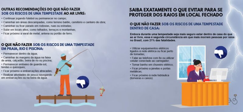 Como há risco envolvido, o Desenvolvido pelo Grupo de Eletricidade Atmosférica (ELAT), do Instituto Nacional de Pesquisas Espaciais (INPE), desenvolveu uma cartilha explicando como o raio se forma e, principalmente, como se proteger.