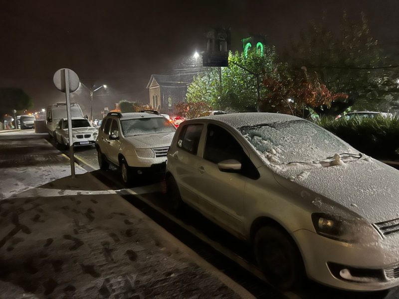 Camila contou que, segundo um alerta do Instituto Nacional de Meteorologia, a previsão é que a neve deve acumular em até cinco centímetros na madrugada desta quarta-feira (18). A neve já começa a acumular sobre os veículos e deixa as calçadas “brancas” na Serra catarinense.