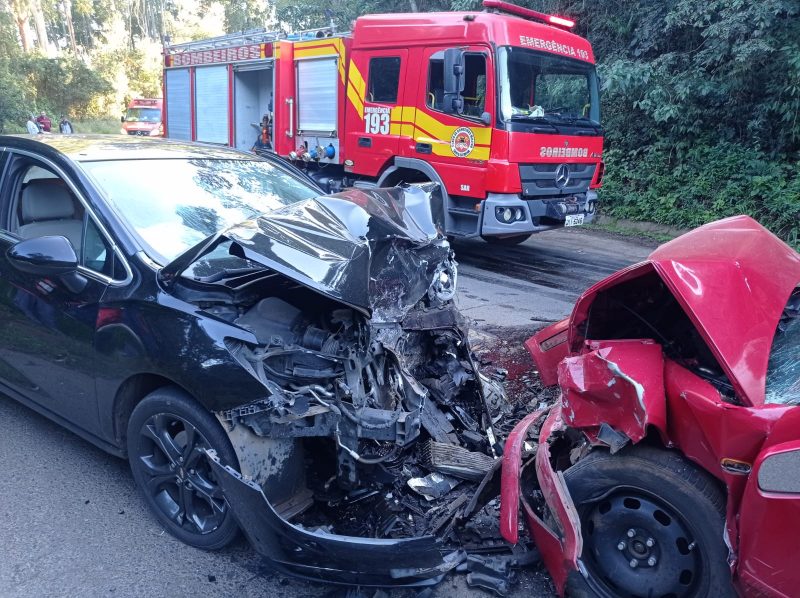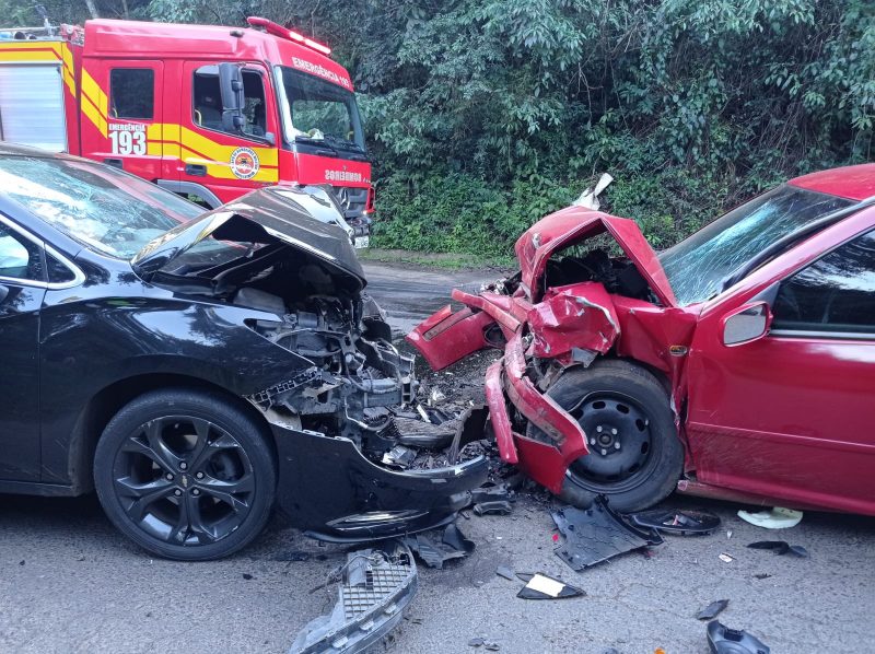 A parte da frente dos carros ficou totalmente destruída e a lataria retorcida. – Foto: Lucas Polak/NDTV Chapecó - 5 de 7